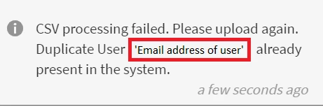 To resolve this issue, you must have the same email address and UUID for the user on the CSV and the system