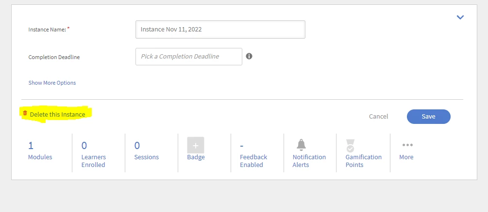 - The Delete Instance option is only available for Self-Paced course instances and instances with no learners enrolled.
