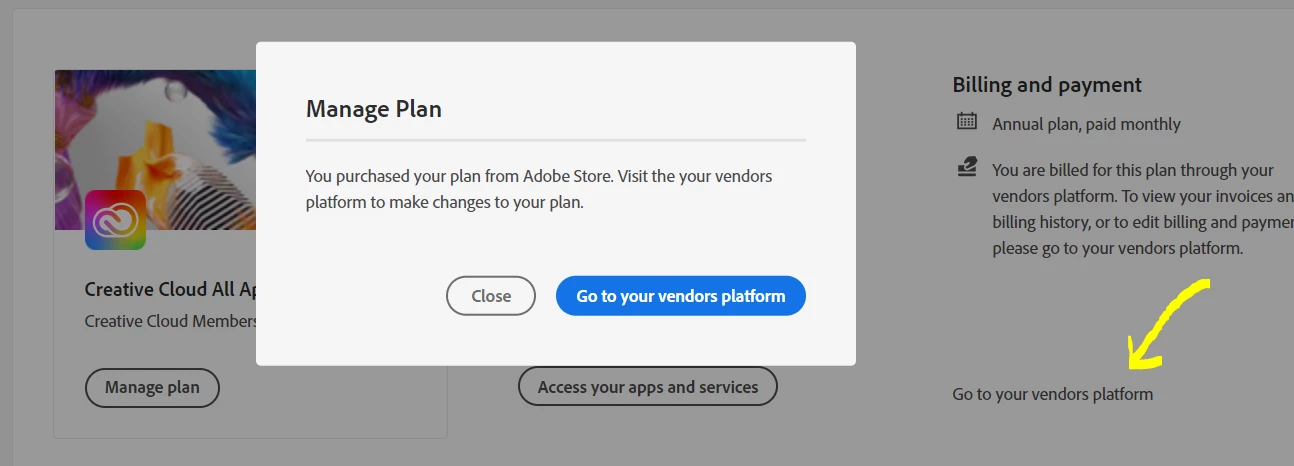Adobe keeps asking I go to my vendor platform to update my credit card. But there is no link for it.