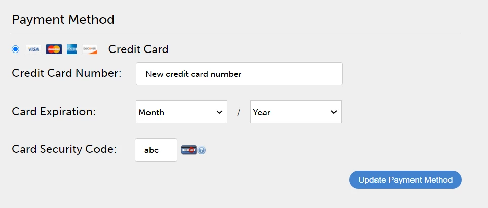 In the Order History tab, for an active account, click Edit. Then on the Subscription Details page, click Edit Subscription. Enter your new credit card details and click Update Payment Method.