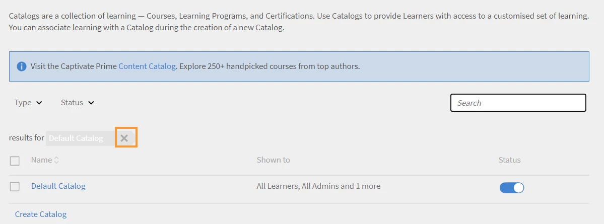 - To search a catalog, type the name of the catalog in the search bar. Once you see the list of catalogs, choose the catalog.