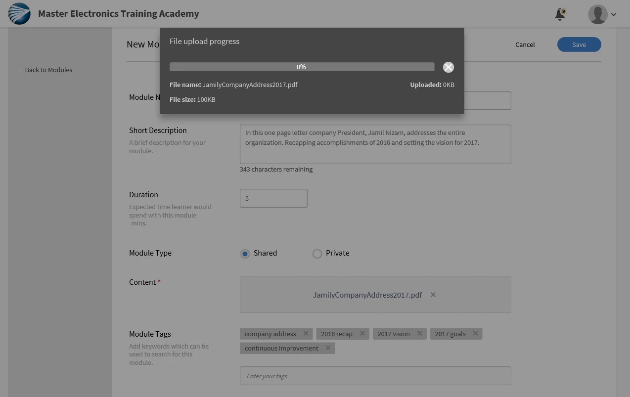 I am trying to upload a PDF as a module.