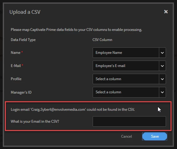 I'm not able to upload a CSV file containing a list of "first/lastname", "email address", "title", "Manager email" and I wanted to know if even though my manager accounts have already been created, whether they would need to be added to the CSV file regardless of their existence.