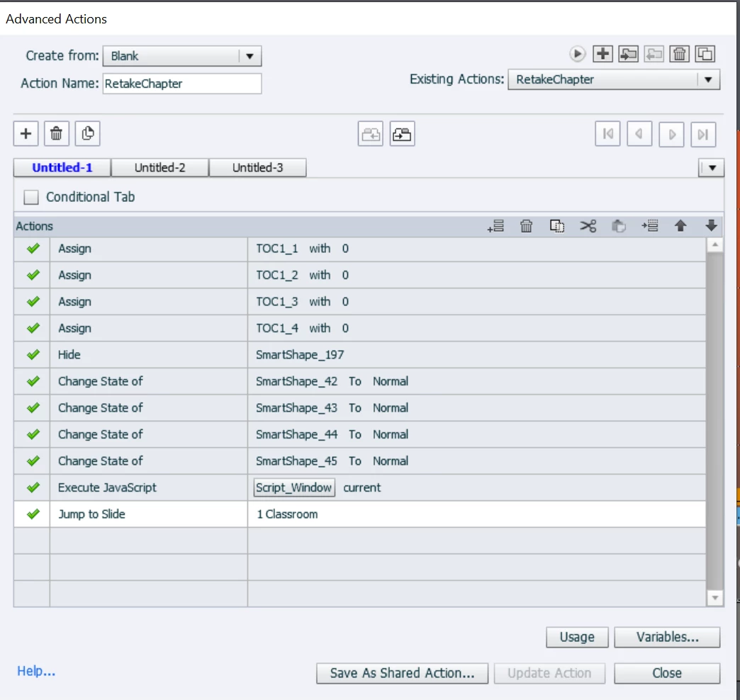 I re-engineered 2 dozen Captivate project files for our first course to be put in our AC Prime LMS, and the only portions of the Advanced Action that took was Hiding the Smartshapes that were previously Shown and Jumping to Slide 1.