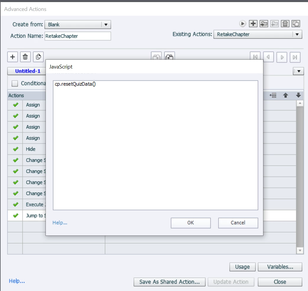 I have built many many SCORM files with Captivate 2019 with a "Retake Chapter" button added to the Quiz Results slide. The Advanced Action attached to this button Assigns all User Variables to zero, Changes States of all necessary Smartshapes back to Normal, Hides Smartshapes that were previously Shown, Executes JavaScript "cp.resetQuizData()" in the Current Window, and Jumps to Slide 1 (pic attached). Effectively, this is a "master reset button" for the SCORM file when the student has failed the Quiz too many times, forcing them to start back from the beginning. This Advanced Action works flawlessly when previewing it from Captivate 2019.