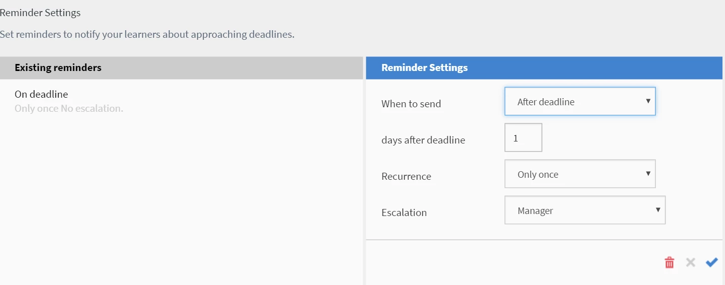 I am setting up a certification in Prime. When setting up reminders I see that the reminders I add include "No escalation" which implies I can set up escalation. I can't find anything in the documentation about escalation of notifications to any other person such as their manager or the training department.