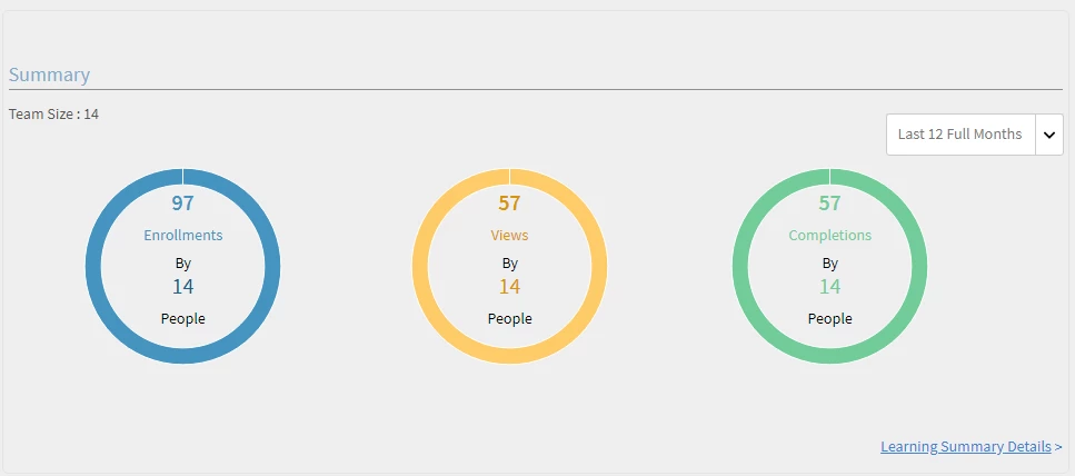 See a summary report of all the learning activities in the platform. On this page, you can see the following summary information for the selected root user’s team and external profiles. Time range can also be selected: