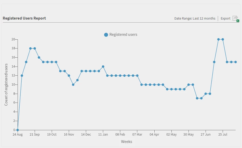 - Registered Users: This report provides information of the number of users registered in your account week over week. For accounts with Monthly Active Units licensing, the report shows the MAU units instead.