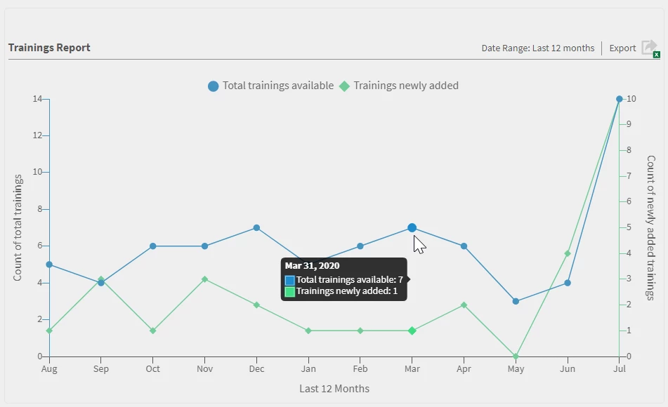 - Trainings report: This report provides information of the total trainings available in the platform (in published state) month over month. It gives an indication of the number of trainings offered over time.