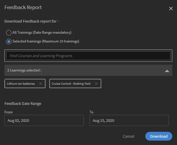 As an Administrator, you can now fetch both Learner feedback (L1) and Manager feedback (L3) for selected trainings for a specified period.