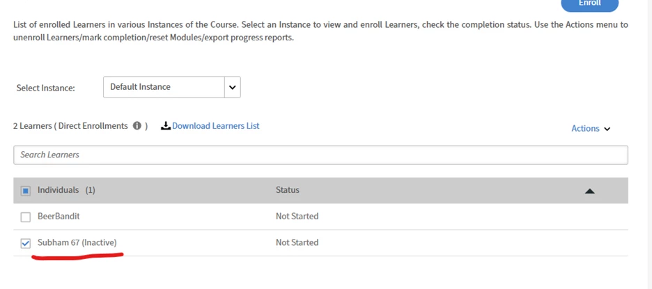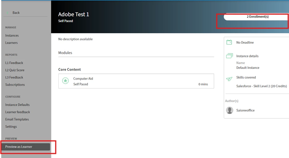 The enrollments number will show active users + deleted in Preview as a learner page as shown below: