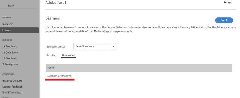 However, after deleting the user, you can also unenroll that user from course. We can see the unenrolled users under the ‘unenrolled tab’ as below: