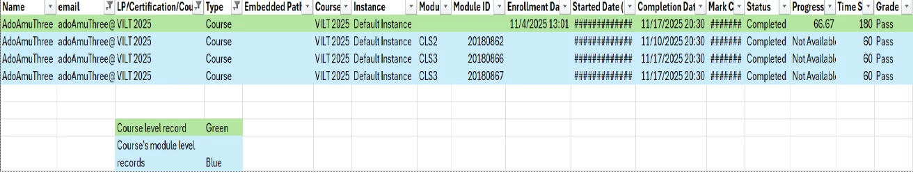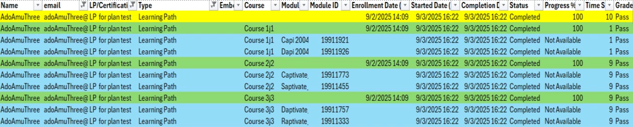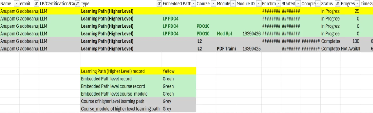 Report structure for Learning Paths: Depending on the count of courses and modules of those, the learning path rows will be multiple with same learning path name/Training ID.