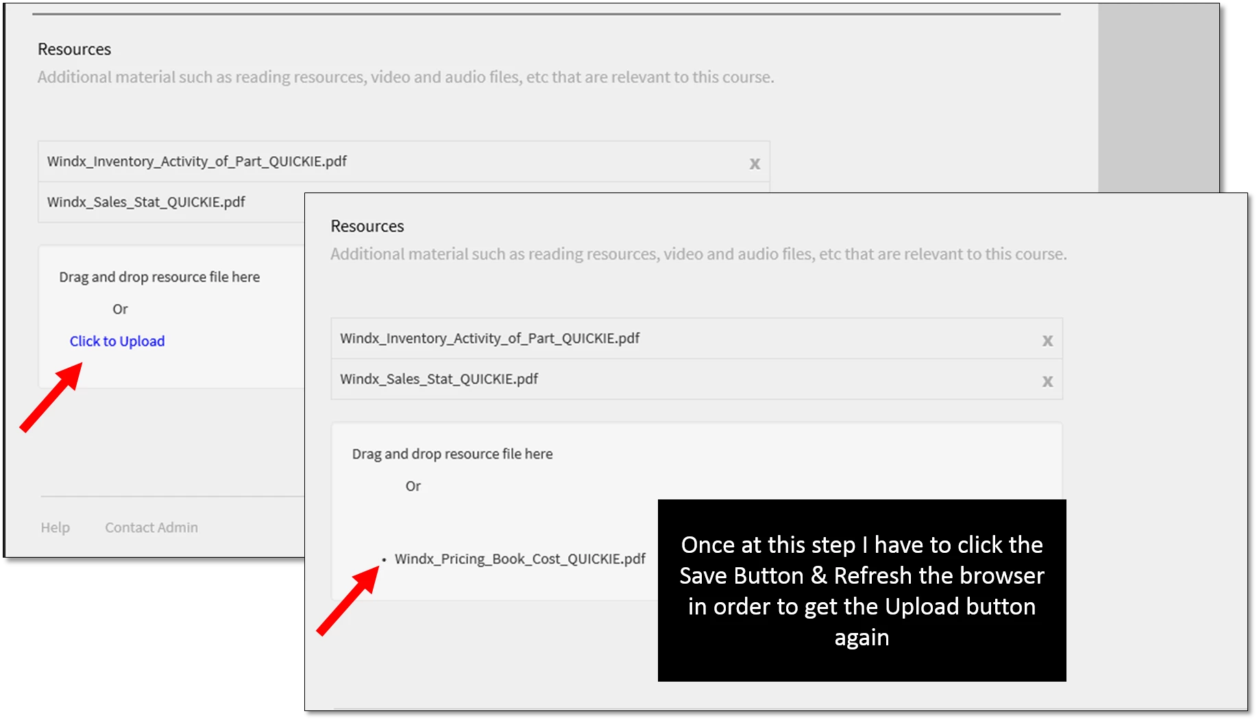 On the course settings page I am trying to drag/drop multiple PDF files to upload as Resources to the course. Each time I attempt the drag/drop, the ACP window closes. I had to upload the files one by one. And, even with that process/(those steps); once the PDF is uploaded I have to refresh the window, after Saving, to get the "click to upload" button to re-appear.