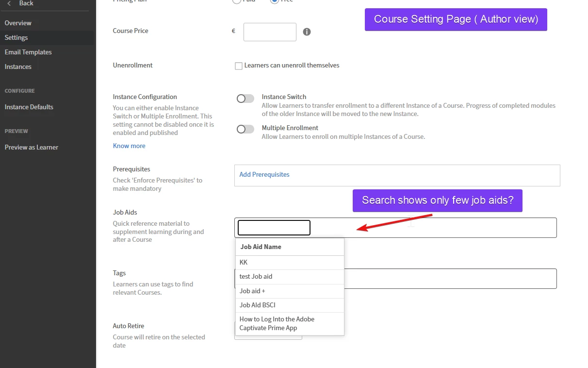 All Job Aids are not visible when using the search field in Course Settings. The dropdown shows only a few items, making some Job Aids appear “missing.”