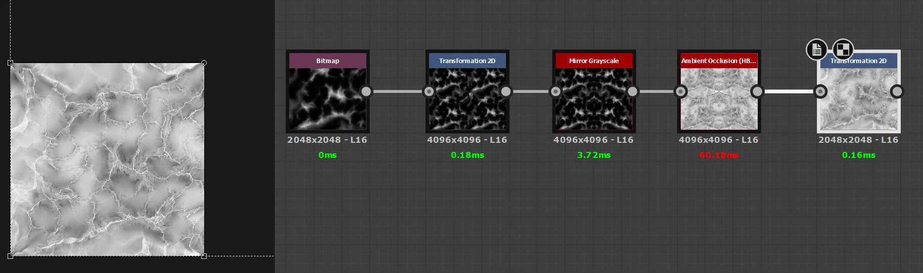 Then a transform node set to absolute 2048 x 2048 (same as original image) and offset x -0.25 Y 0.25 that takes the output image from the lower left quarter