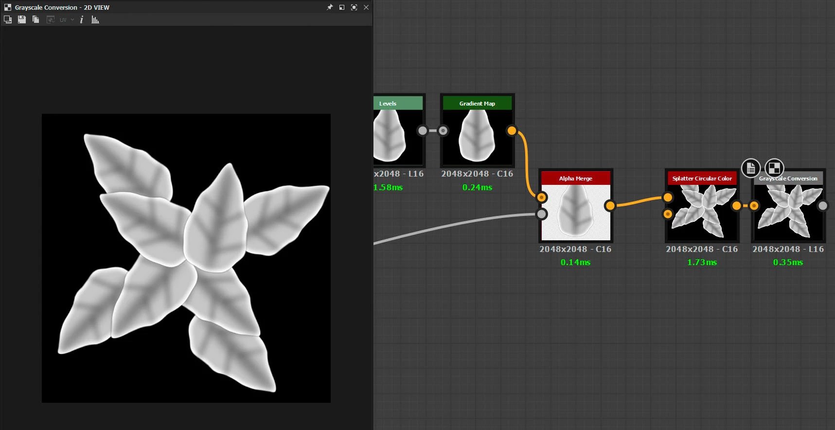 If you want the individual 'leaves' to overlap with no transparency, you could convert to colour using a gradient map and add an alpha channel based on the shape. Then use Alpha Blend in a Splatter Circular Color node. You can convert back to grayscale, if you need to, to continue your graph.