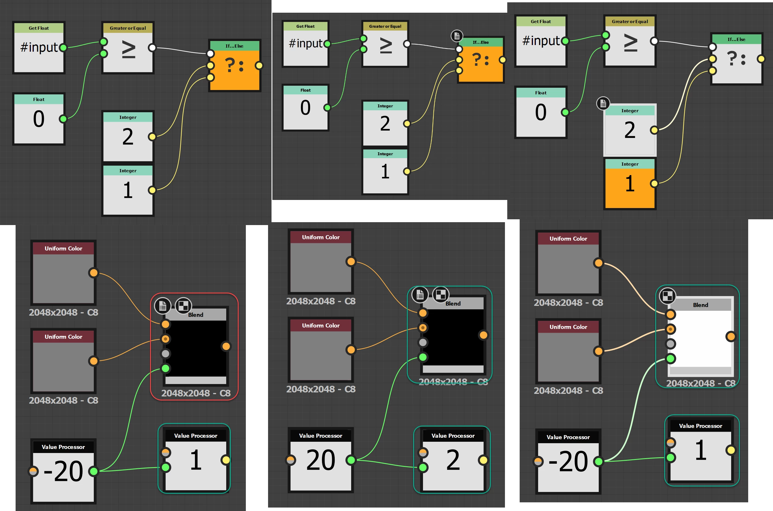 It works when I am trying it in the Parameters tab, but not in the Preview (same in Painter). Looks like the condition always answers False in the preview tab (and painter) but not in the parameters tab.