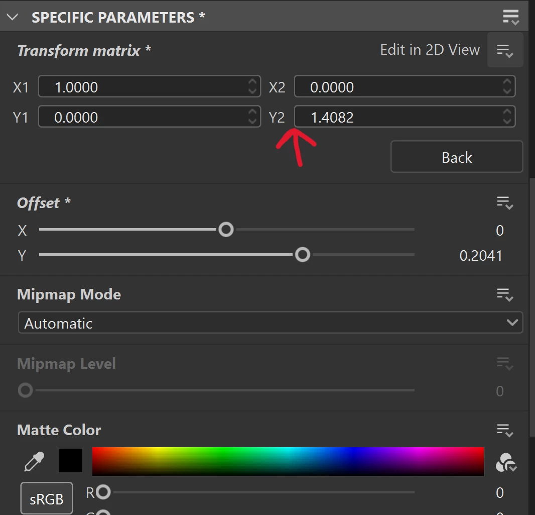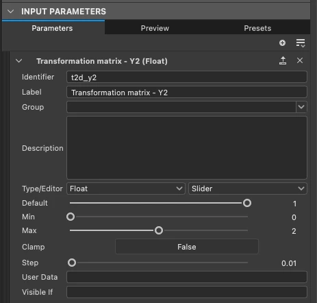 A simple way to connect an exposed Float parameter to the matrix's Y2 component is to build a Float4 value using a Vector Float4 node, which combines any pair of values that together add up to 4 Float components – E.g., Float and Float 3, Float2 and Float2. The final value is the result of appending the 'Last' input to the 'In' input.