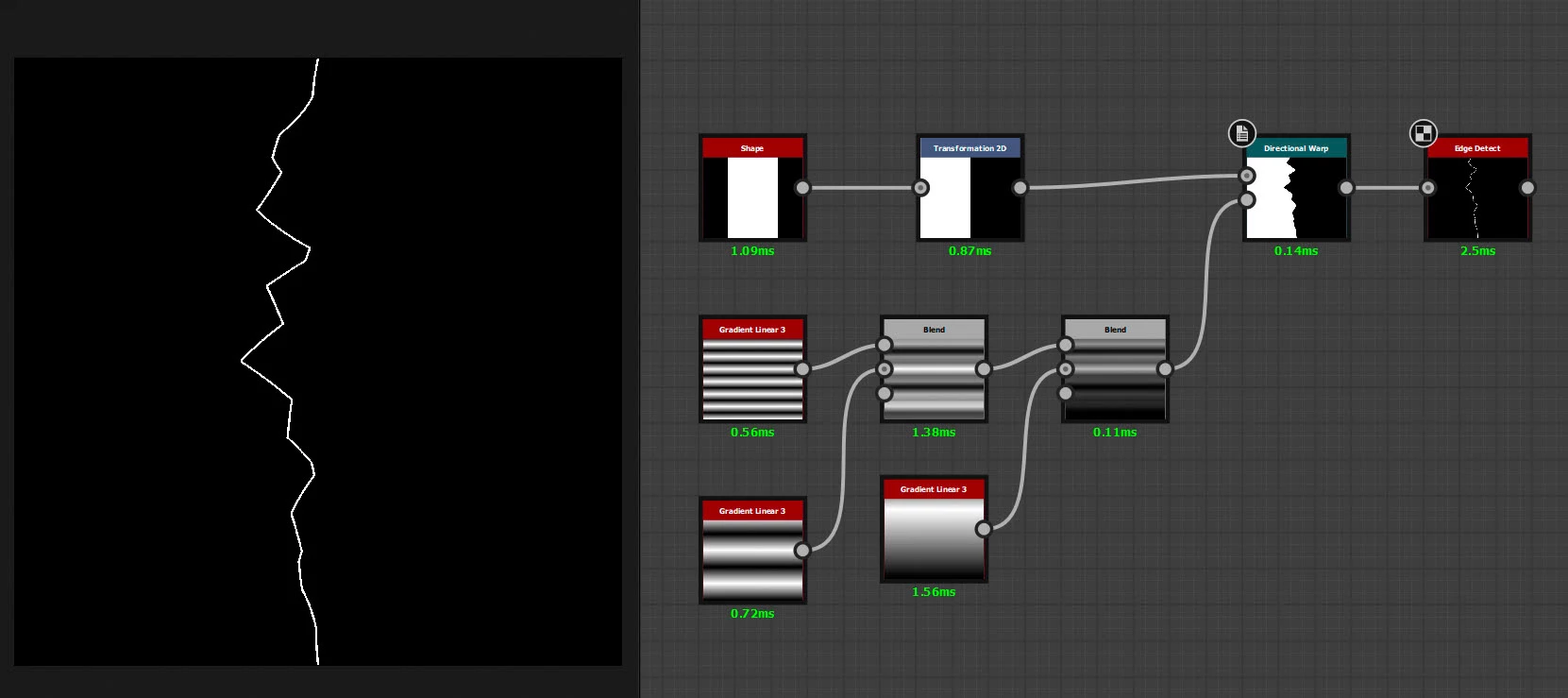 I'm trying to create a lightning chain out of default square shape. The shape must be distorted in such a way as to consist of straight segments. Like a polyline. I tried my best with different warp nodes and noises but so far no luck. It always comes out curved and with variable thickness.