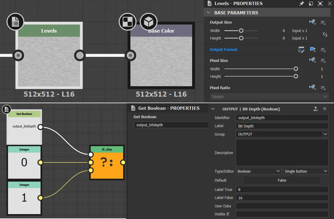 Although not listed specifically in the documentation, it looks like the output format bit depth is being treated as a static parameter (which is switchable from setting up the parameter but not in preview). A static parameter can be switched on editing the graph, but not on the fly after the graph is cooked. For the same reason it would not appear in a published sbsar.
