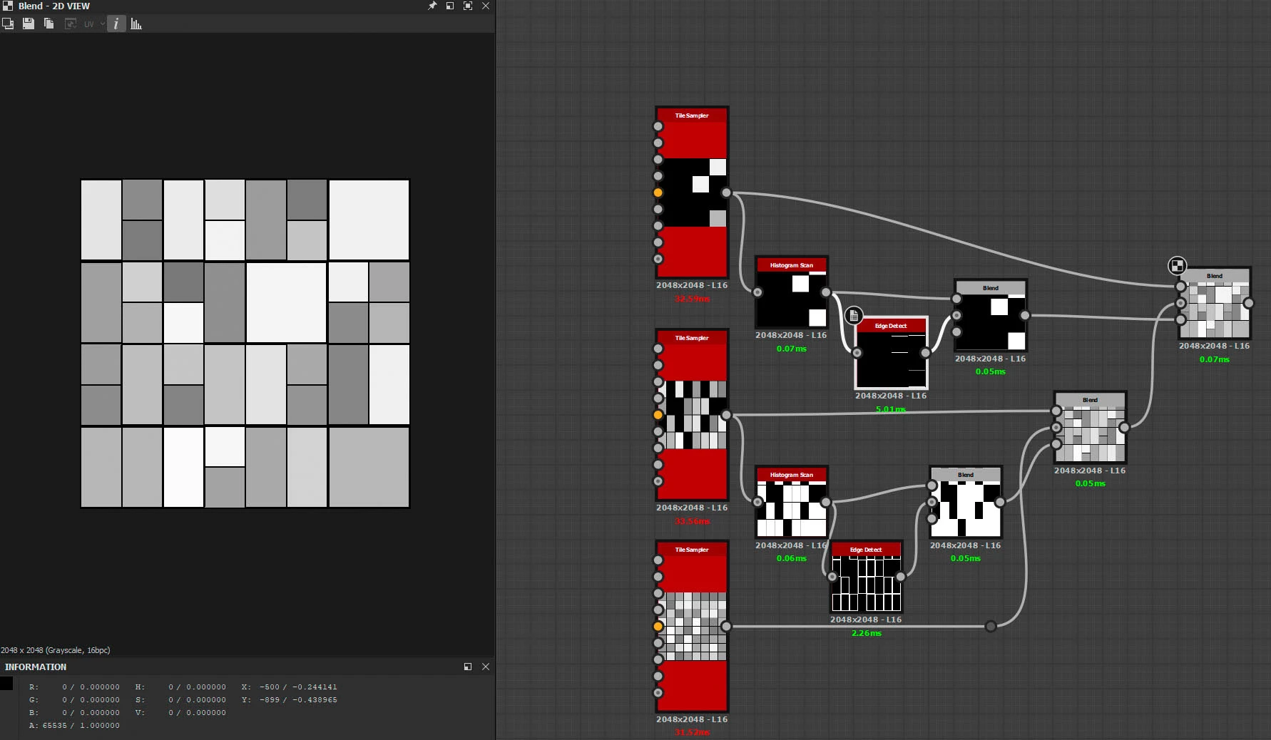 The connection to the main blend modes should be the mask (from histogram scan + edge detect) into the opacity input and the tile sampler outputs into the foreground and background.