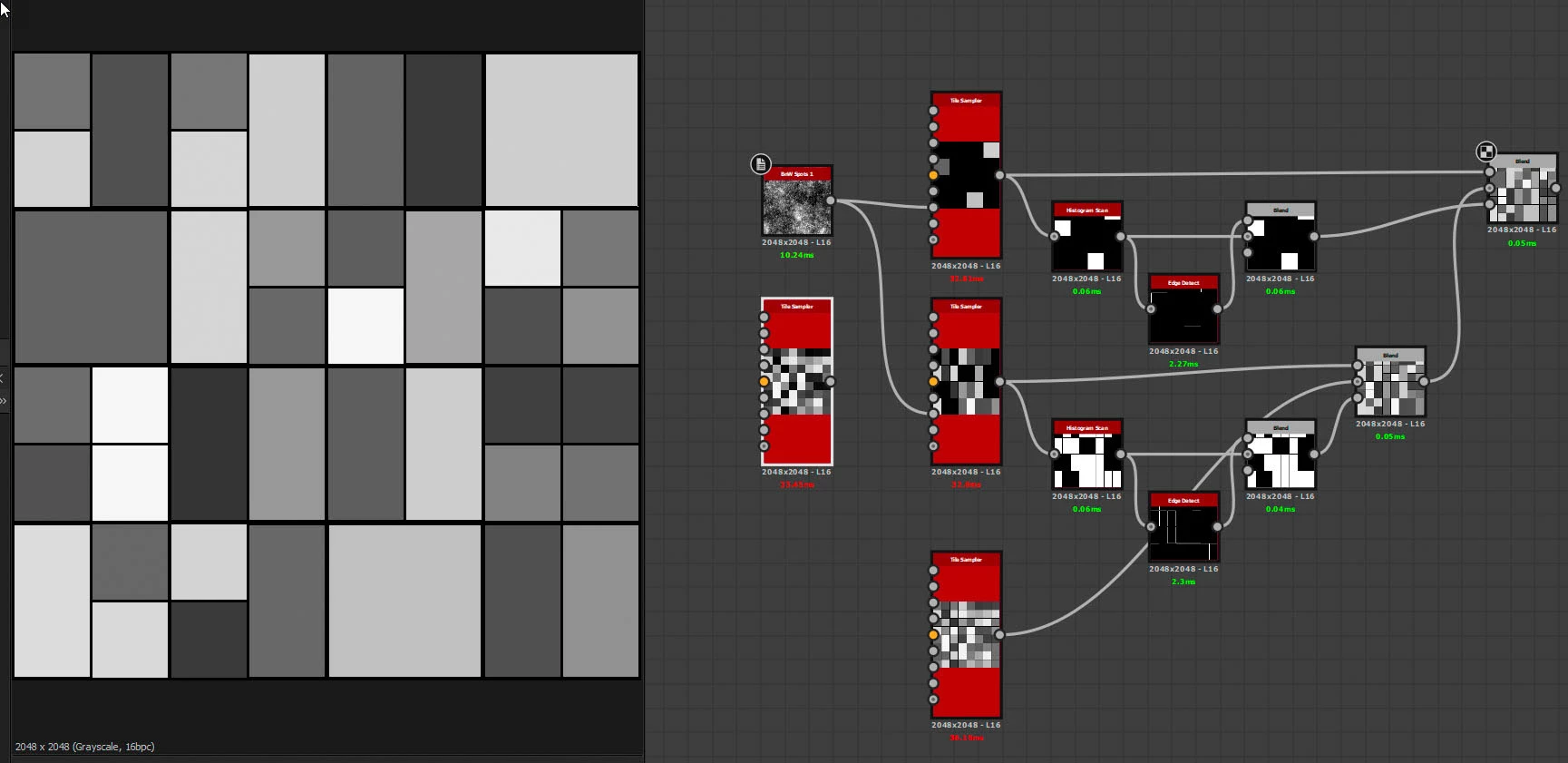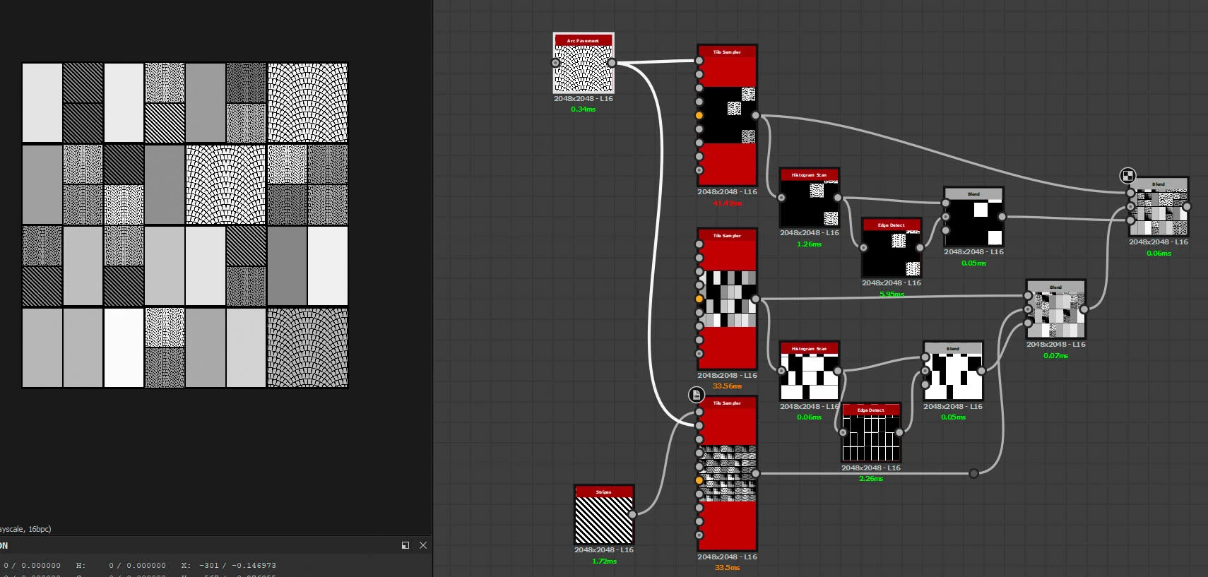 The histogram scan nodes need to be set to position 1 and contrast 1 - the idea being to get a pure white version of the tiles to use as a mask. The edge detect needs to be inverted, the line width widened slightly, and then the following blend node set to add so that it adds that edge to the masked tile shapes.