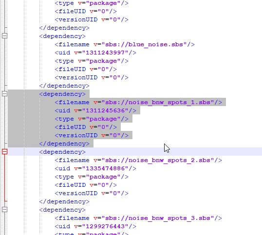 In the meantime, you may open the Substance 3D file (SBS) with a text editor and remove unused dependencies manually. These files follow a simple XML structure so the operation is straightforward: simply delete the content of a <dependency> entry along with the <dependency>(...)</dependency> tags, as shown below.