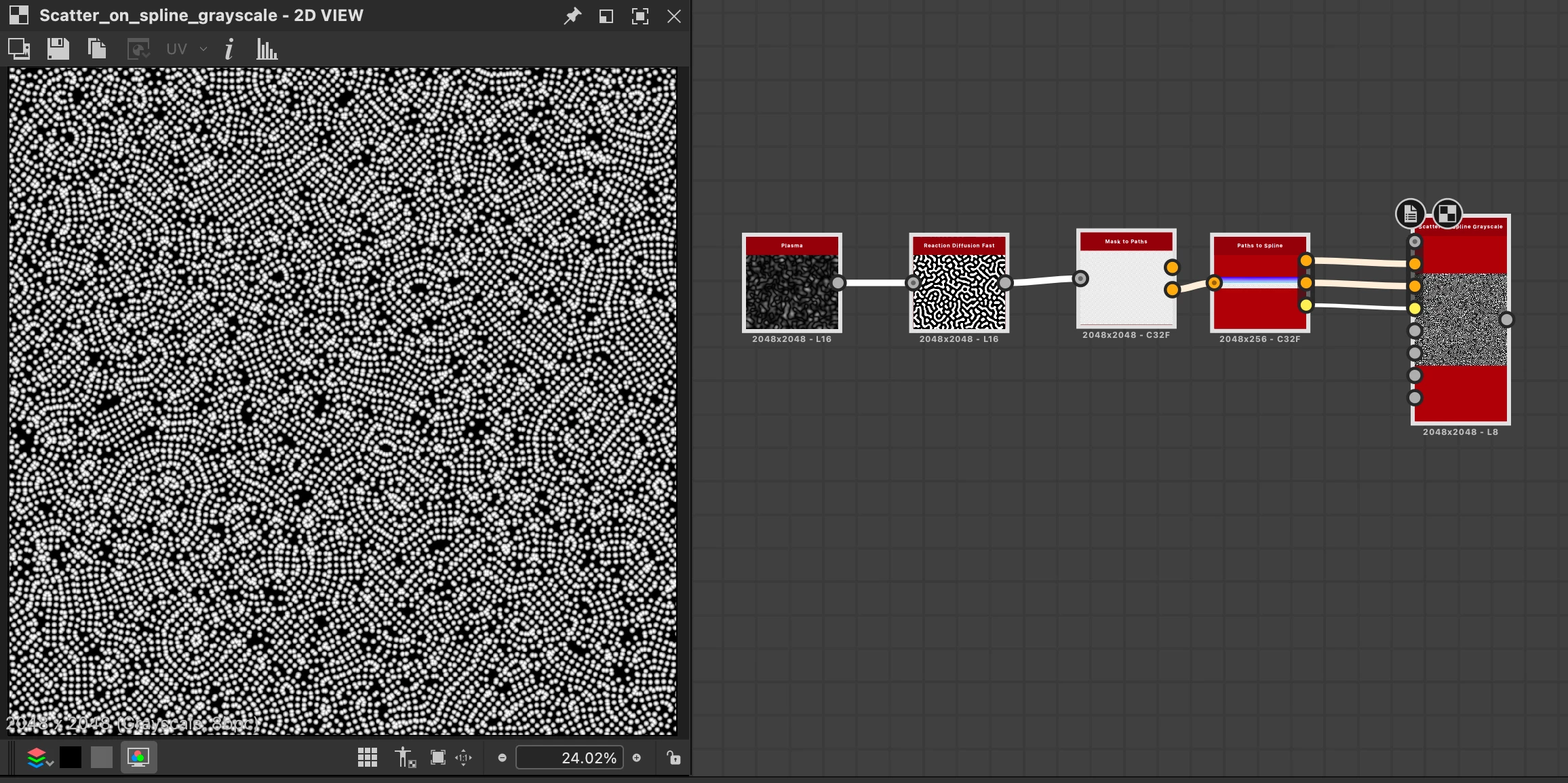 I've also tried turning the black/white swirly texture into curves along which I distributed dots, but that didn't give me the desired result, either - probably because I'm not super experienced with curves (or Designer in general) yet, although it did seem at the time that there were some technical limitations to that approach that made it not work properly for this project.