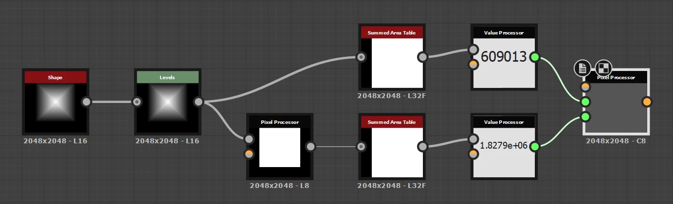 1 is done by sampling the pixel on the bottom right corner of the Summed Area Table node output.