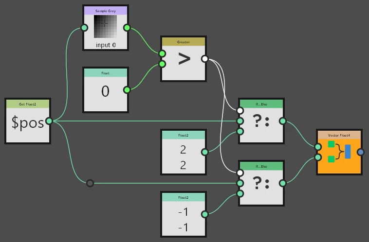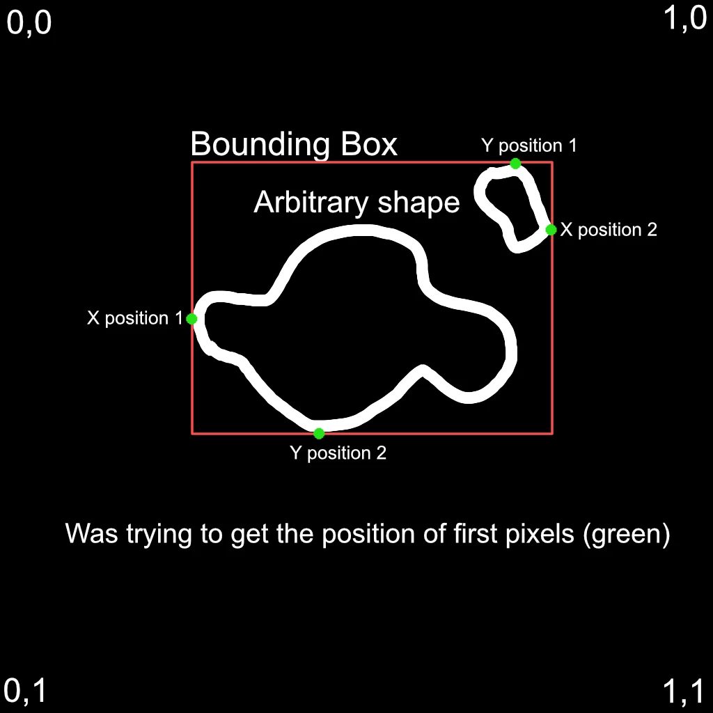 - Prepare your Data, for every Pixel greater 0 (a valid pixel) you set the current Position in the grid as Output, for every invalid pixel you set the output to 2 in the red and green channels and to -1 in the blue and alpha channels. This generates a mask, of -1 and 2 for the min and max values of x and y.