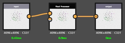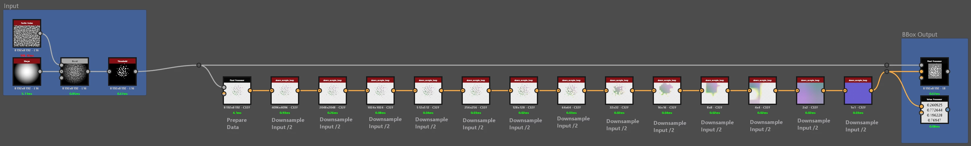 - Next Step is the core idea behind the whole thing, you downsample the image step by step until it's a 1x1 texture, in every downsample step you check the 4 neighbours of every pixel if they are valid and if so, output the minimum and maximum values of x and y of all 4 neighbours. You basically calculate the bounding box of a 2x2 pixel area, in the next step you repeat this step and merge the 4 neigbouring bounding boxes into a new bounding box.