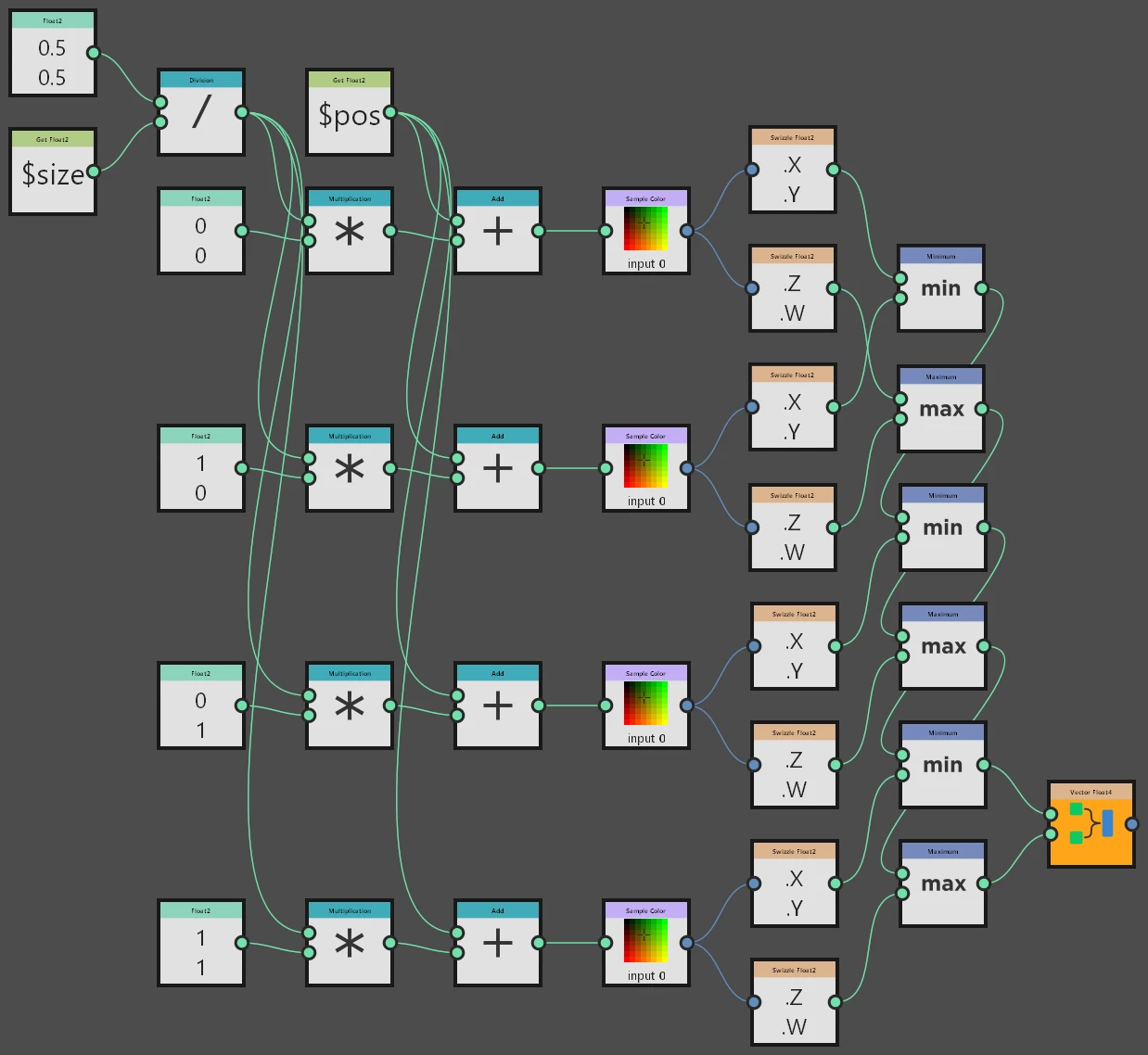 Here is an overview over the compete graph, ignore the first section, it's just an input, you would probably use an input Node for it and do this in a subgraph, in order to reuse it, whenever you need it.