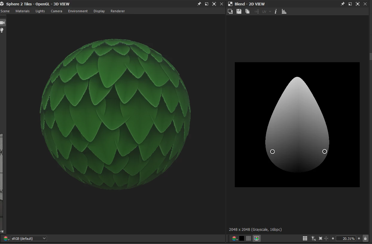 One big problem I keep facing, especially when making foliage type assets, is getting awful looking intersection between the shapes. Here I have a simple leaf shape blended with bottom-up gradient, and placing it in Tile sampler to tile it, but some of the leaves go through each other very un-naturally.