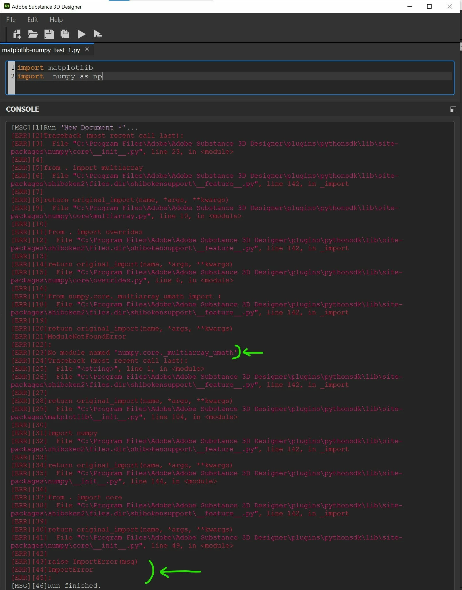 [Numpy & Matplotlib are installed in the right directory. But, Substance Designer's Python Editor can't read\/recognize Numpy??]