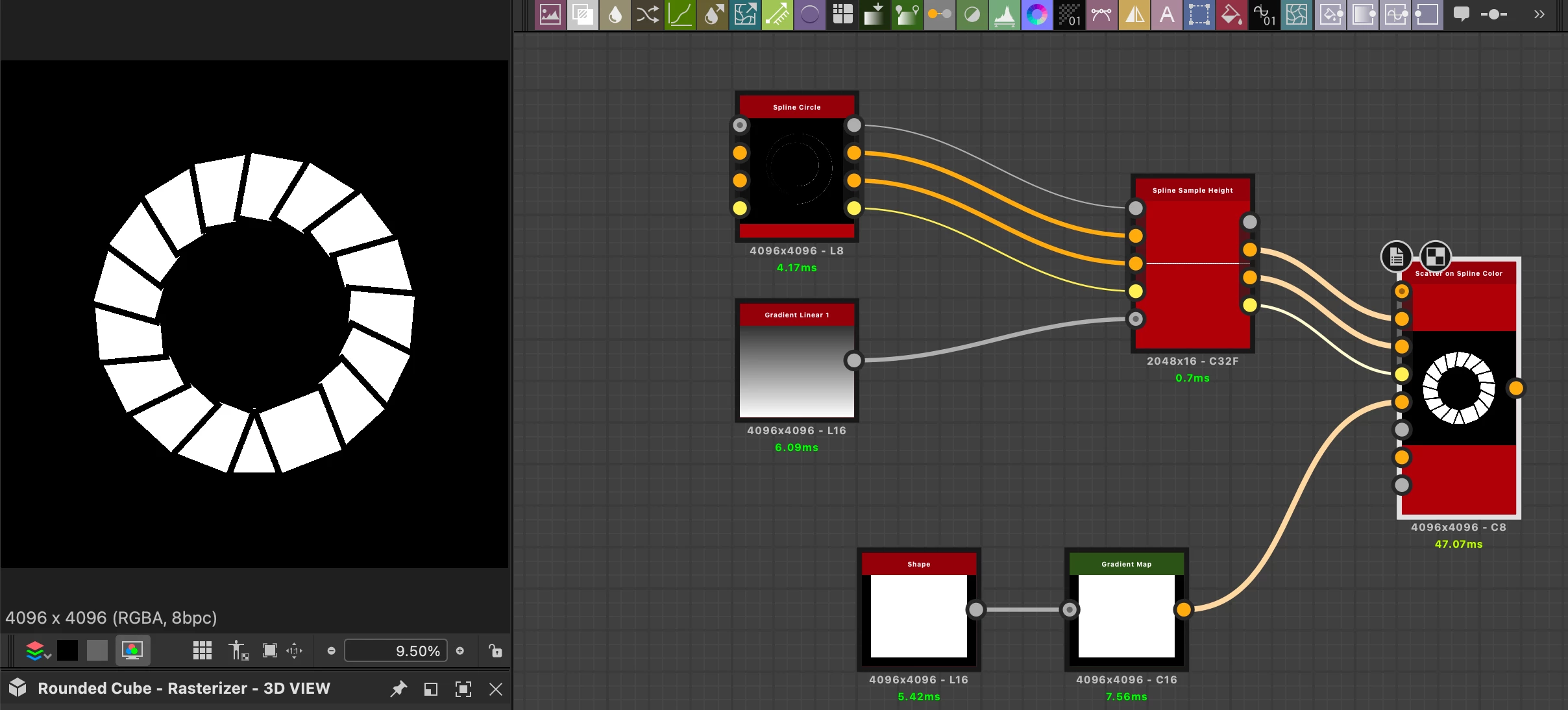 I want to scatter my pattern on a spline, and have it layer the patterns based on a height map (bottom to top). This is easily done in Scatter On Splines Greyscale, but the only blend options in that node at Add or Max, and my pattern has a black outline (so needs an alpha channel).