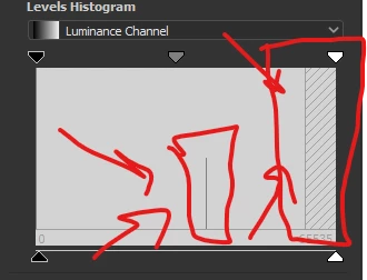 Most of the pixel levels in your input are in a single level, indicated by the spike at that level. There are no pixels at all with levels at the highest end, indicated by the shaded area.