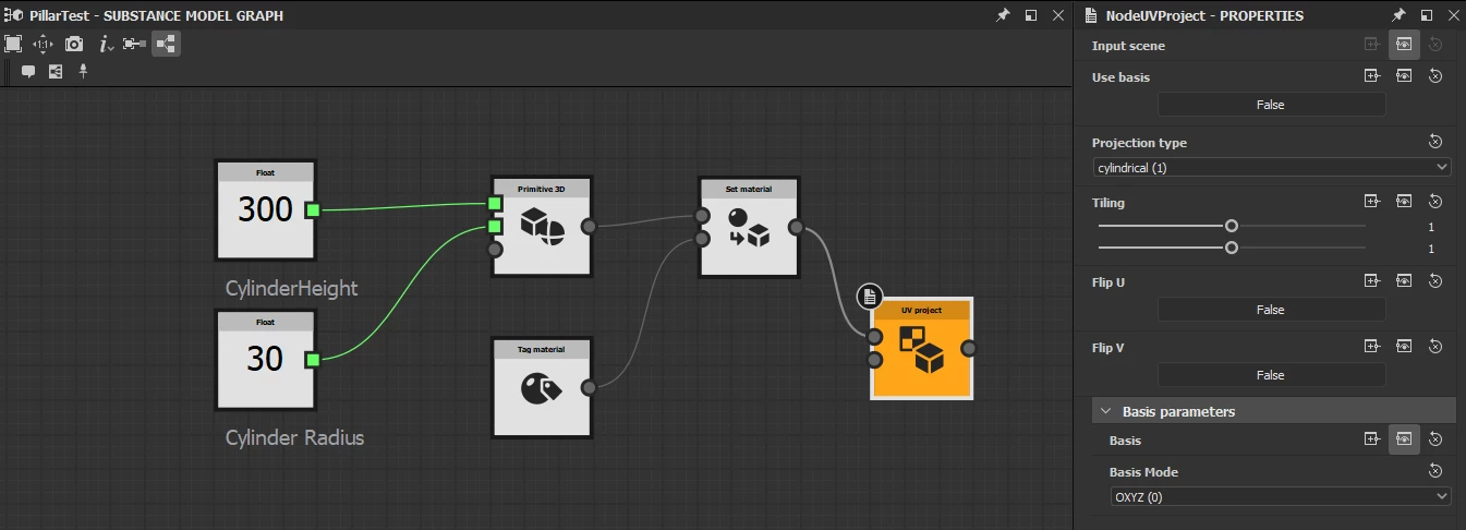 Nodes used to create cylinder mesh and settings of uv project node:
