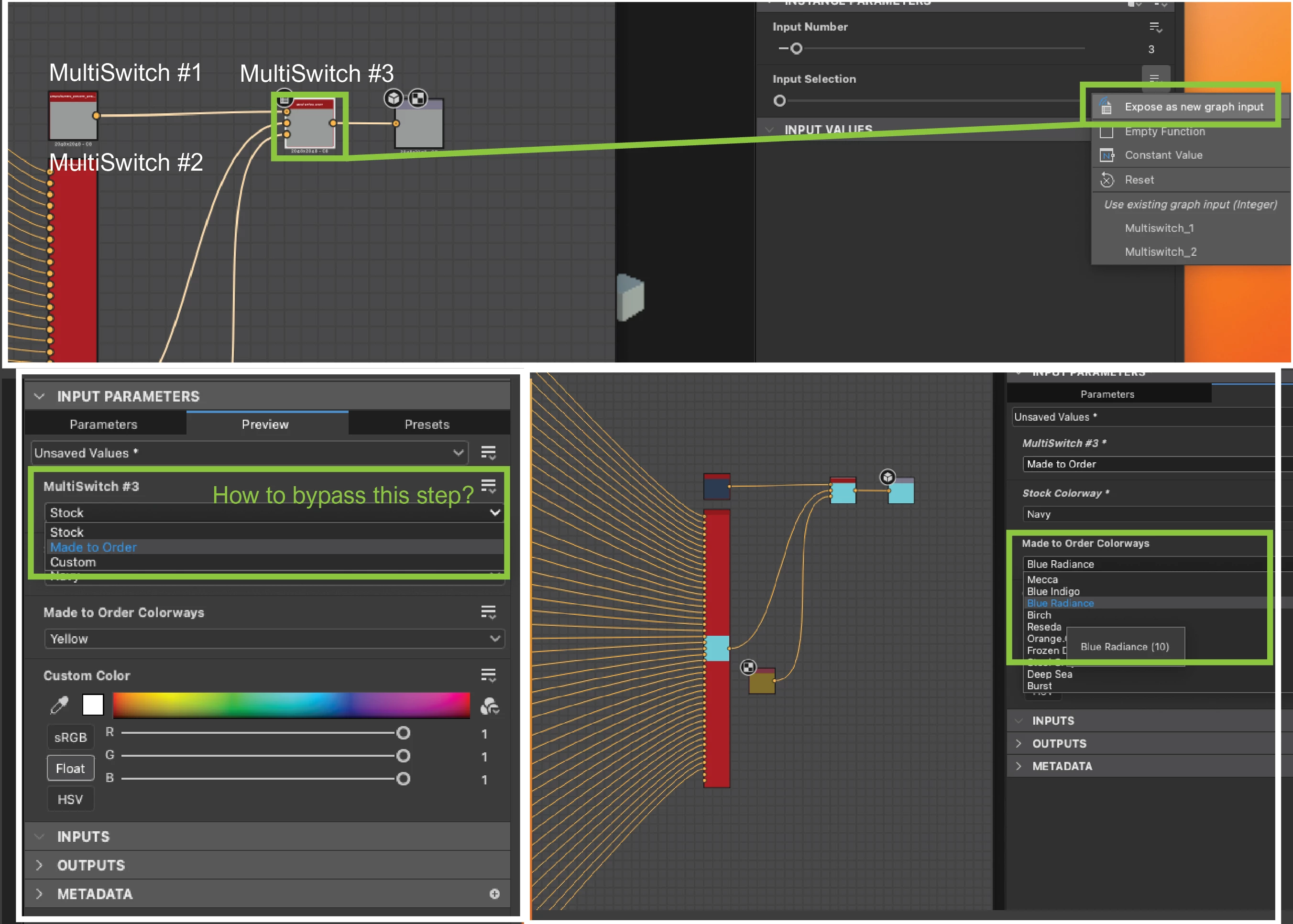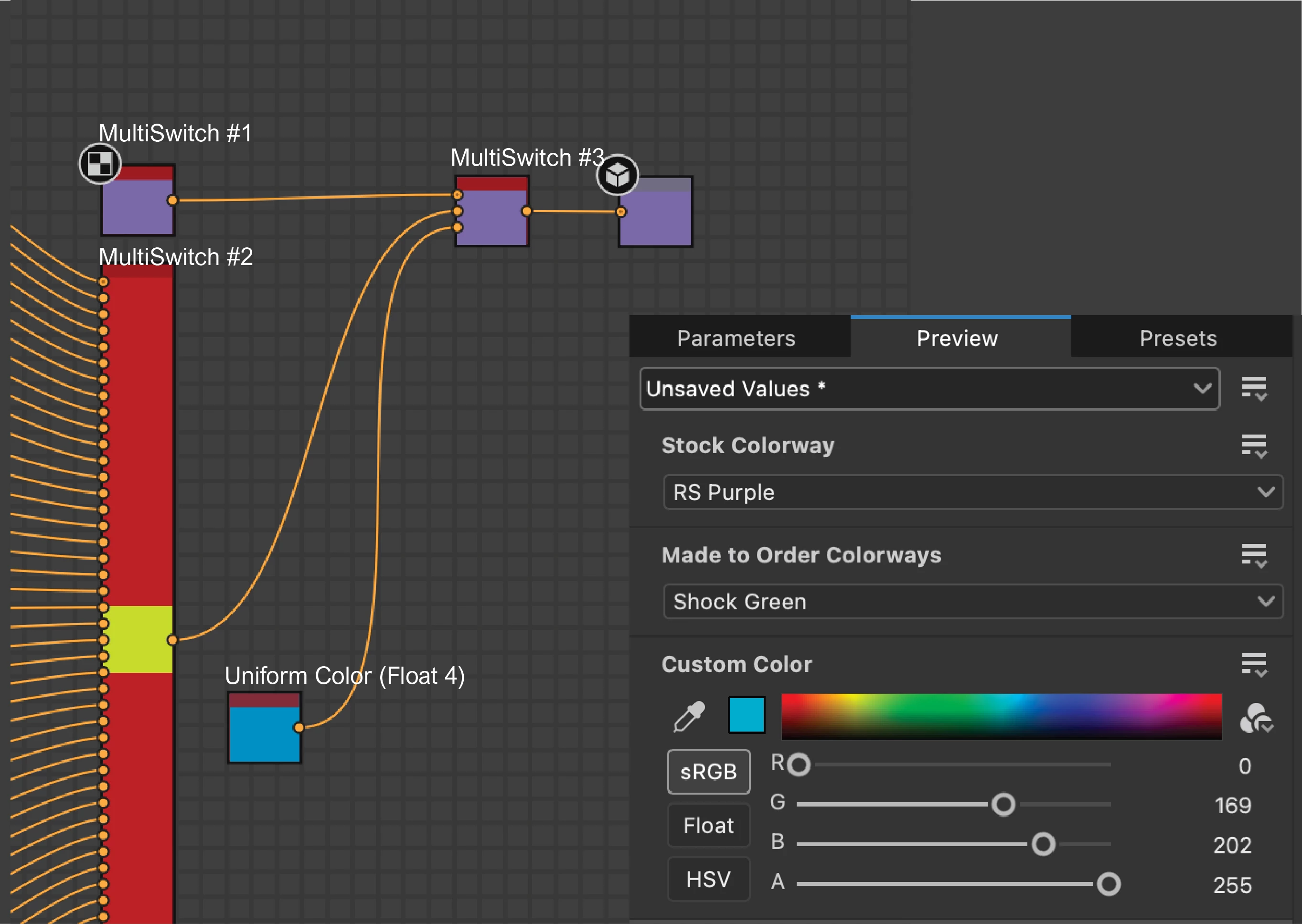 Hi all. I'm brand new to functions and I'm having trouble figuring this out. I have 3 nodes: 2 multiswitches and a Uniform Color. The multiswitches represent prescribed color pallets and the uniform color node represents a custom color option. I'm running all 3 through another multi switch(#3). The goal is that if the end user selects from any of the color pallets, that color is shown in the output. I'm assuming I need to add a function to the input selection of multiswitch #3, but I don't know what to do after that. I imagine one of you smart people could figure this out pretty quickly. I appreciate any help