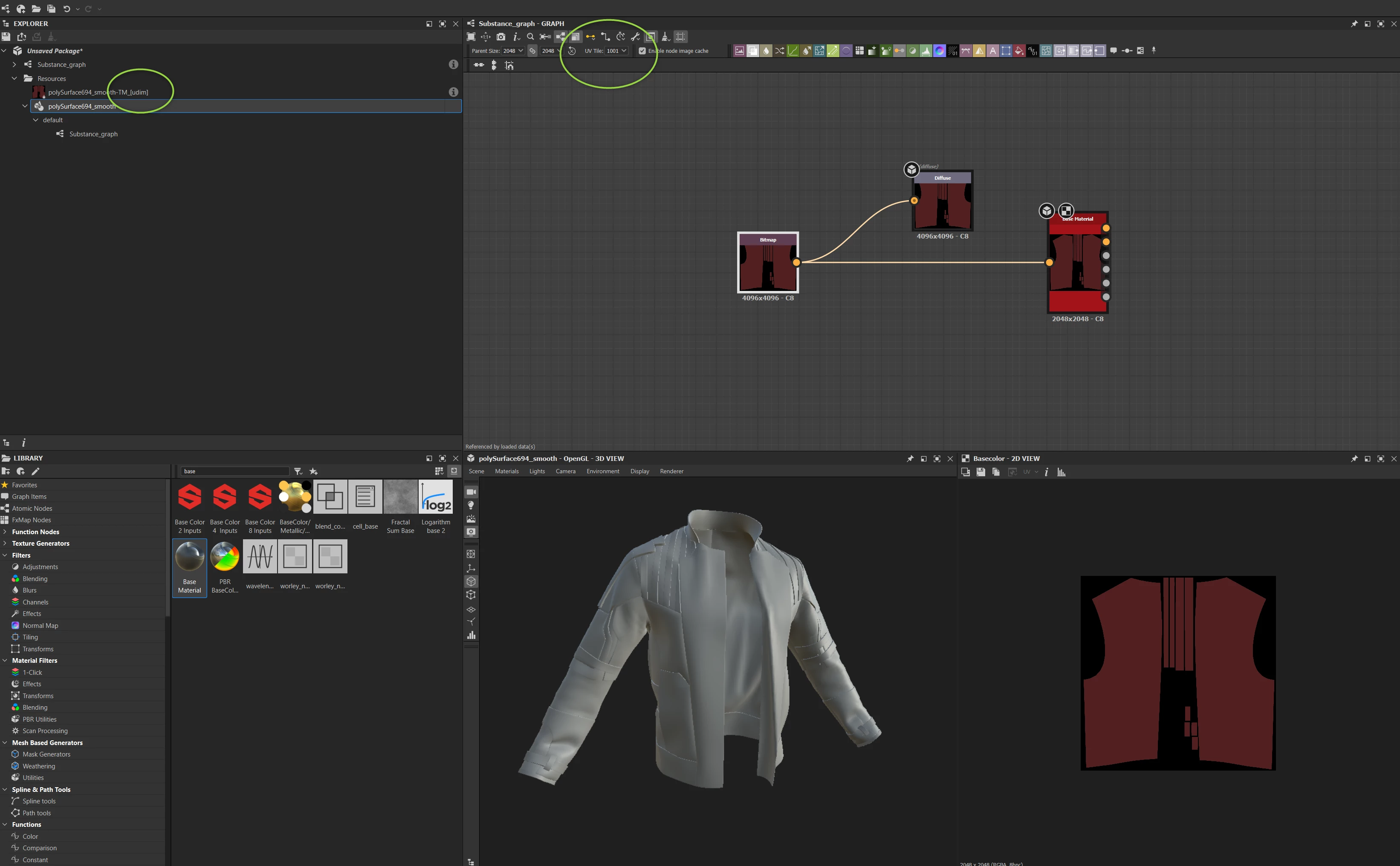 Connect udim texture. And assign Base Material to 3d mesh, base color.
