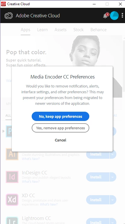 Adobe Creative Cloud keeps asking about Encoder CC preferences