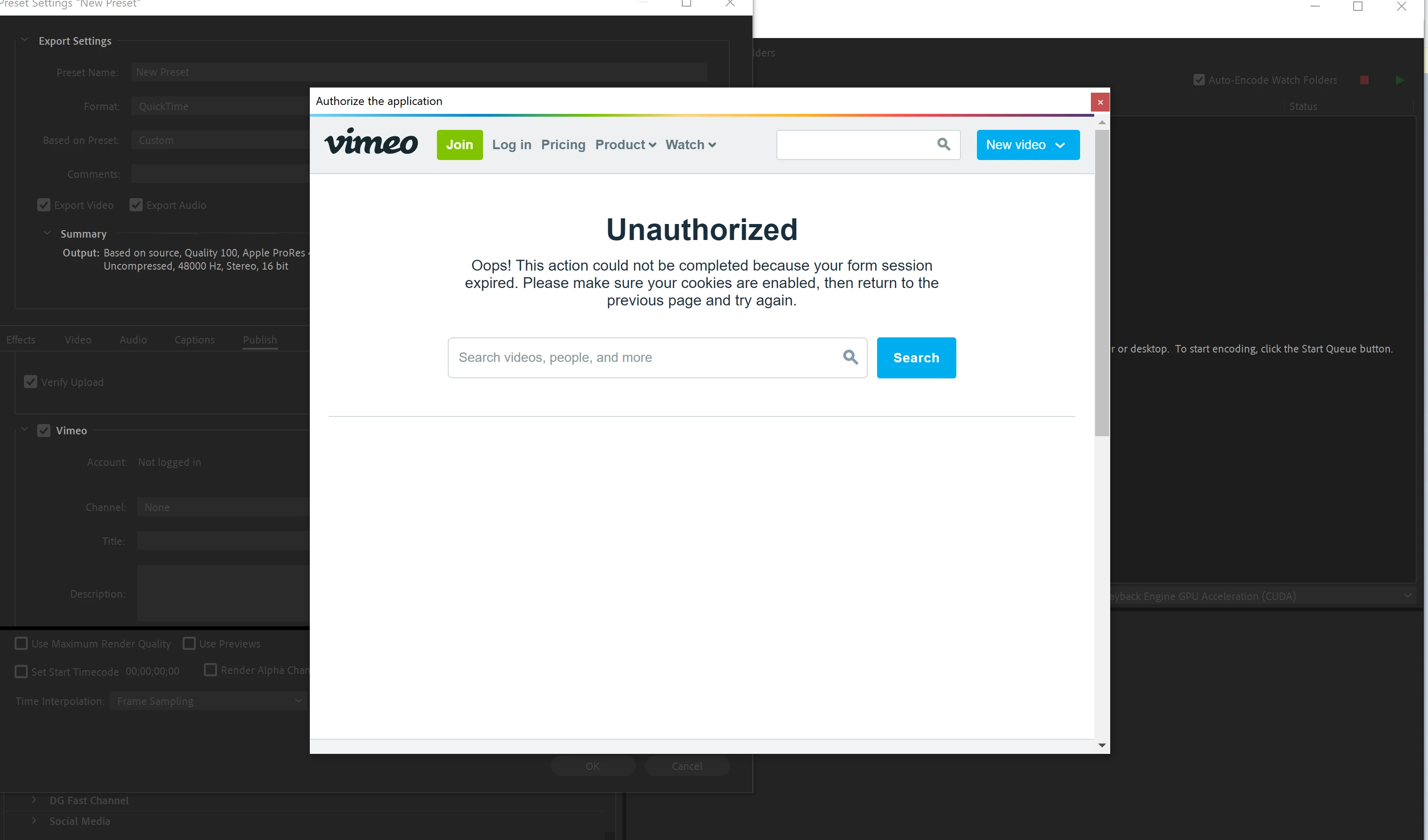 I cant connect vimeo through media encoder. It lets me sign in then takes me to a page that says "unauthorized" (picture attached)