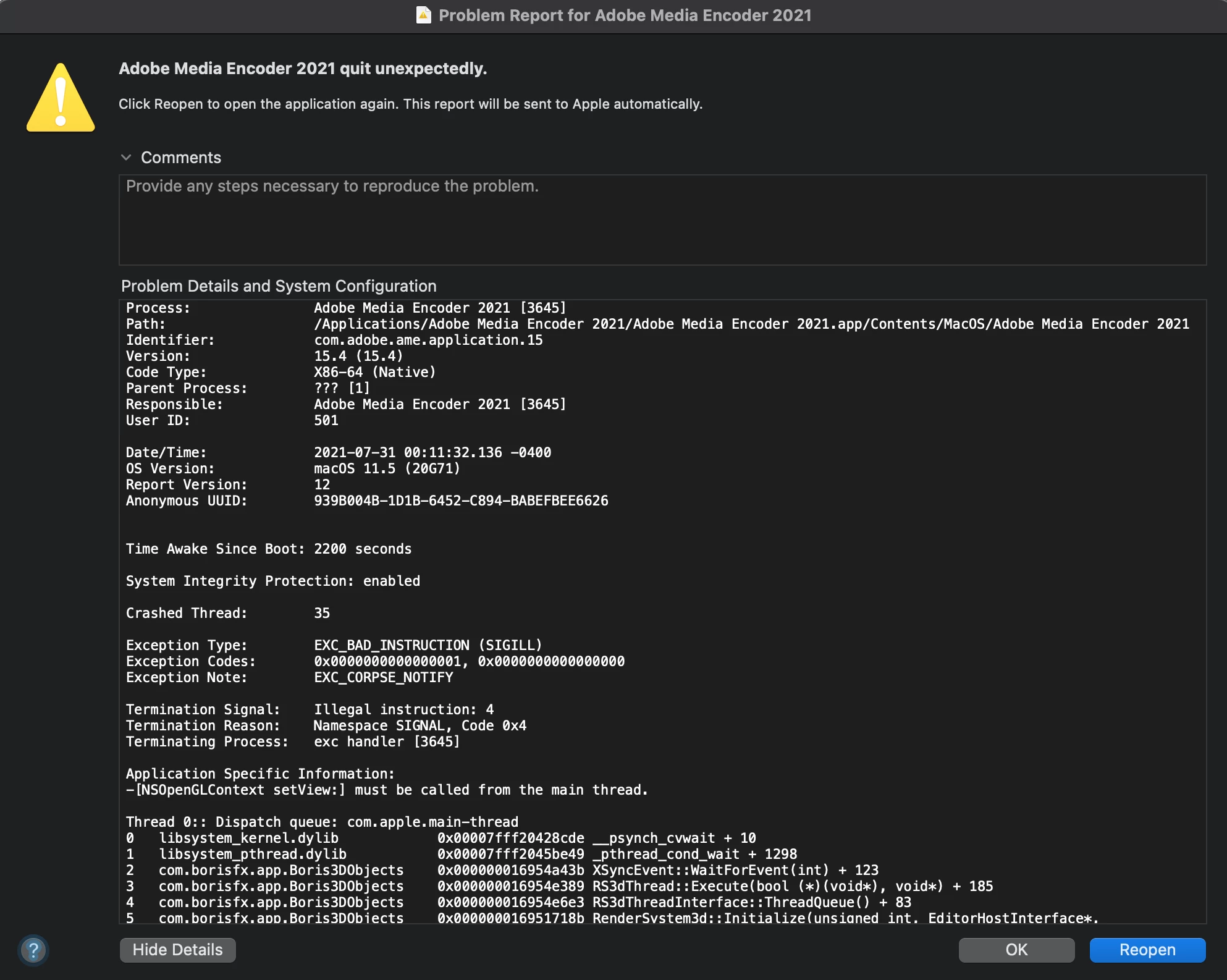 Adobe Media Encoder 2021 don't open on Mac OS Big Sur Version 11.5