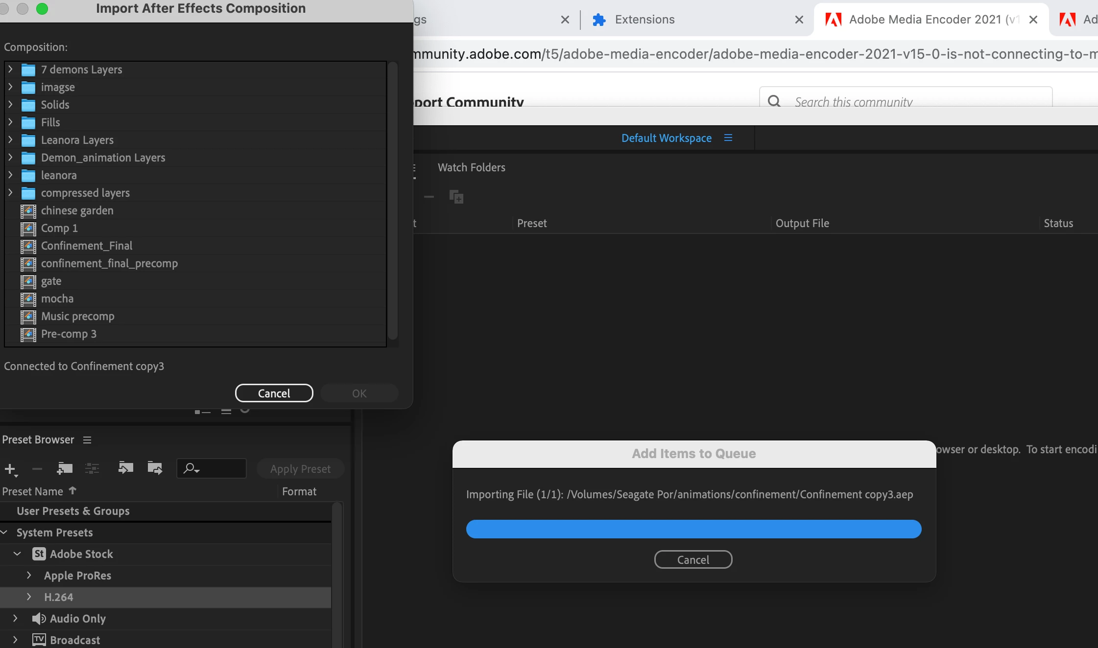 Adobe Media Encoder 2021 (v15.0) is not connecting to my aftereffects 2021 (v18.0.0) project
