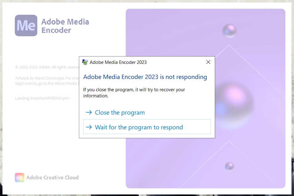 Adobe Media Encoder 2023 freezes and then crashes on splash screen