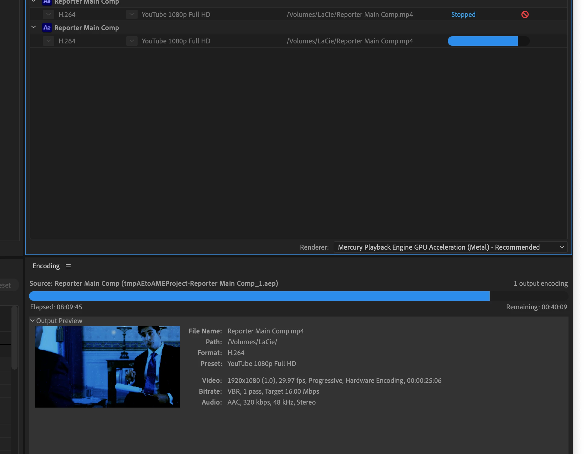 I've stopped it a number of times because I thought it was so peculiar. I made sure Adobe Media Encoder and After Effects were updated, then I restarted my computer and tried again only to find the same problem. I was sure that updating the programs so they were up to date with Catalina would solve it. But this seems really funky.