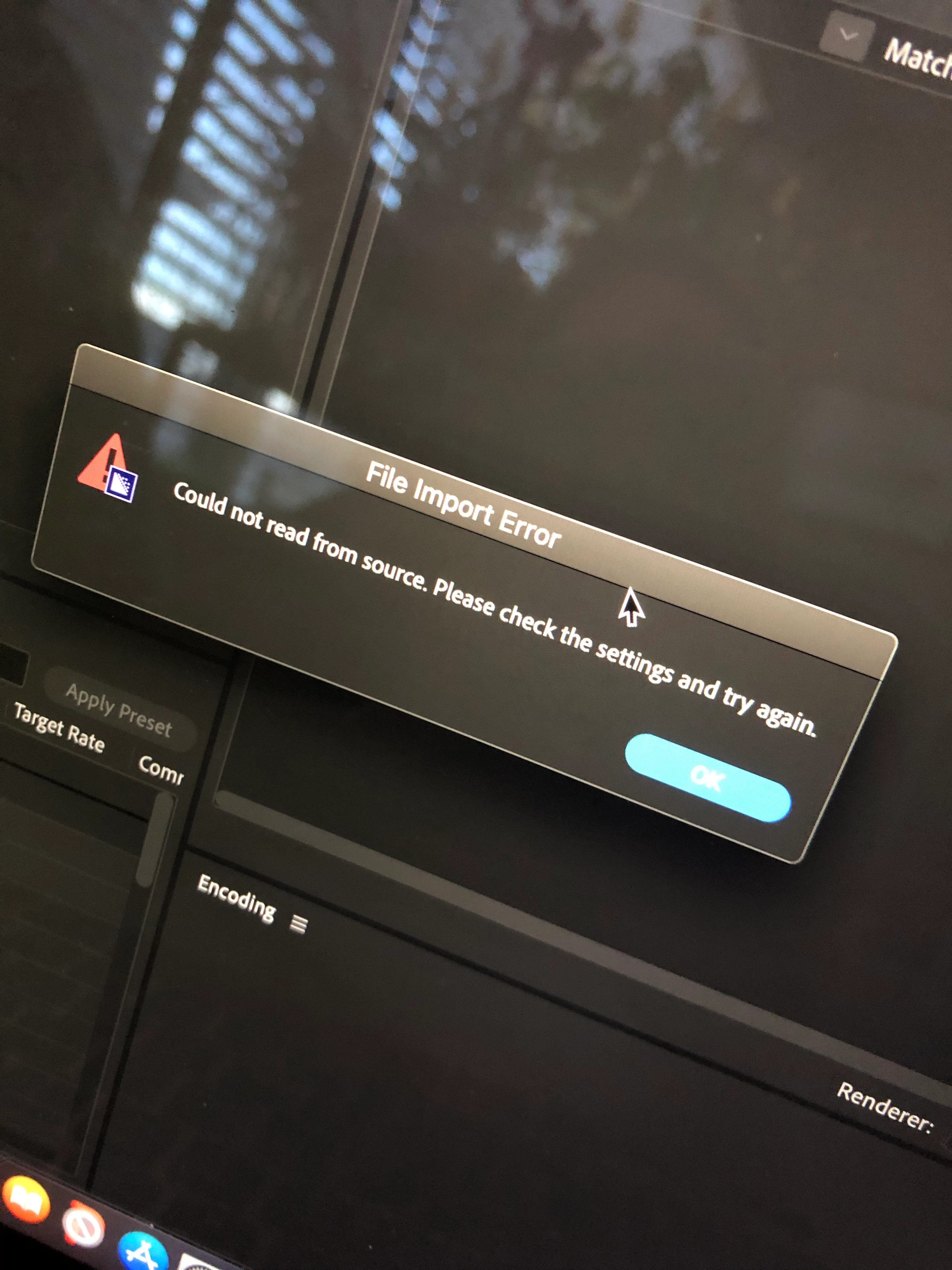 Hi! When I'm importing a project file from after effects into media encoder and then try to open the file in media encoder a "file import error pops up" saying, "could not read from source. Please check the settings and try again." I don't know why this is happening because when I try doing it with a different project it works.