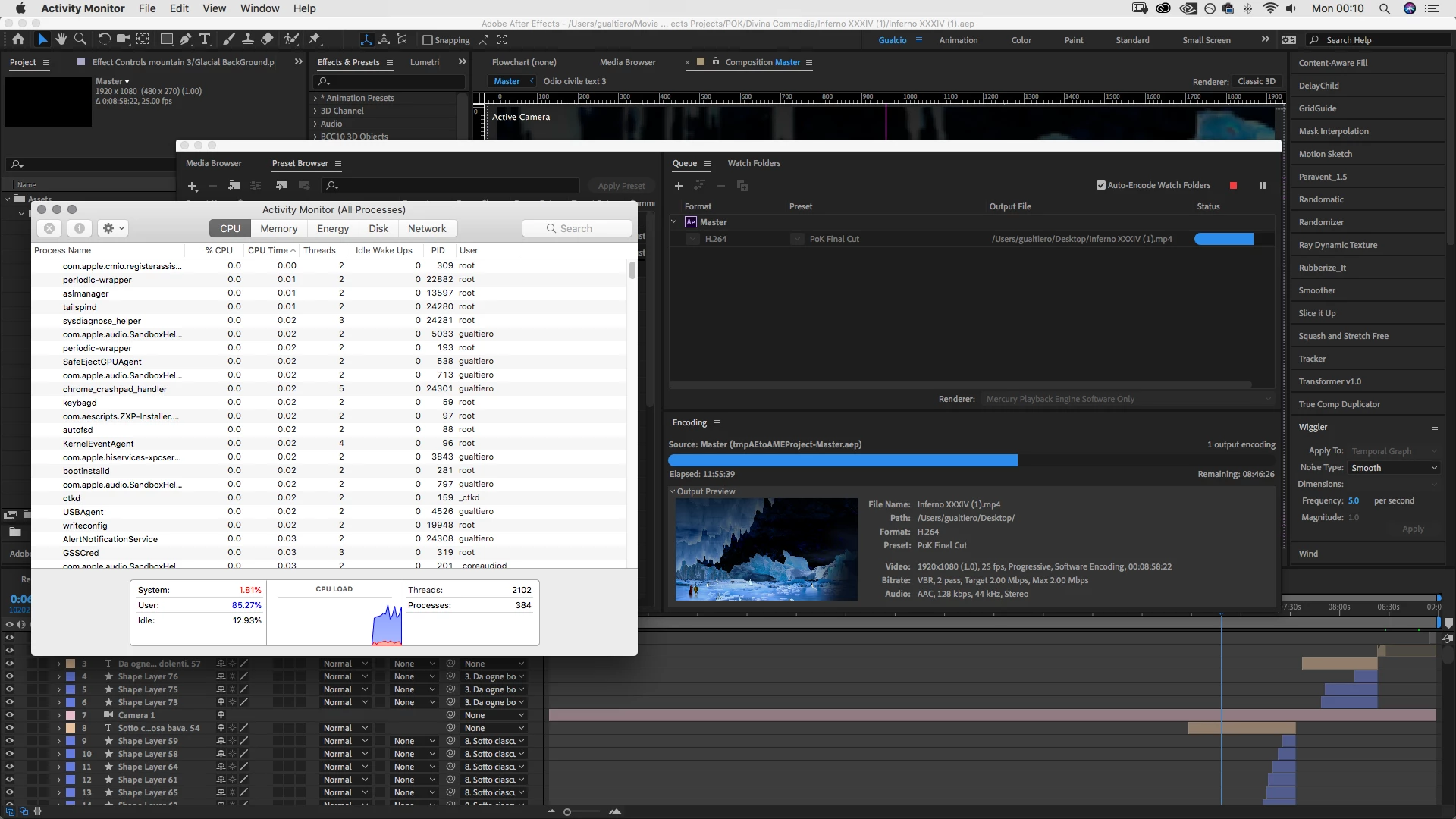 My fan spins like crazy when I do a long and loaded-effects project. Unfortunately I am not able to understand what to tweak or change to solve this issue. Sometimes I am afraid that I'll break my machine if I don't find a solution. In the screenshot I uploaded, you can see what how much power AME is taking in monitor activity if that can help. Also I wrote my machine specs.