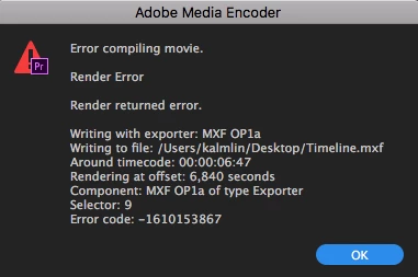 Hi, I have a problem with a "render error" when I'm trying to export a clip, it's in MXF-format and I have this problem with only a few of my clips. You can look at the screenshot, but the "error code" is: -1610153867.
