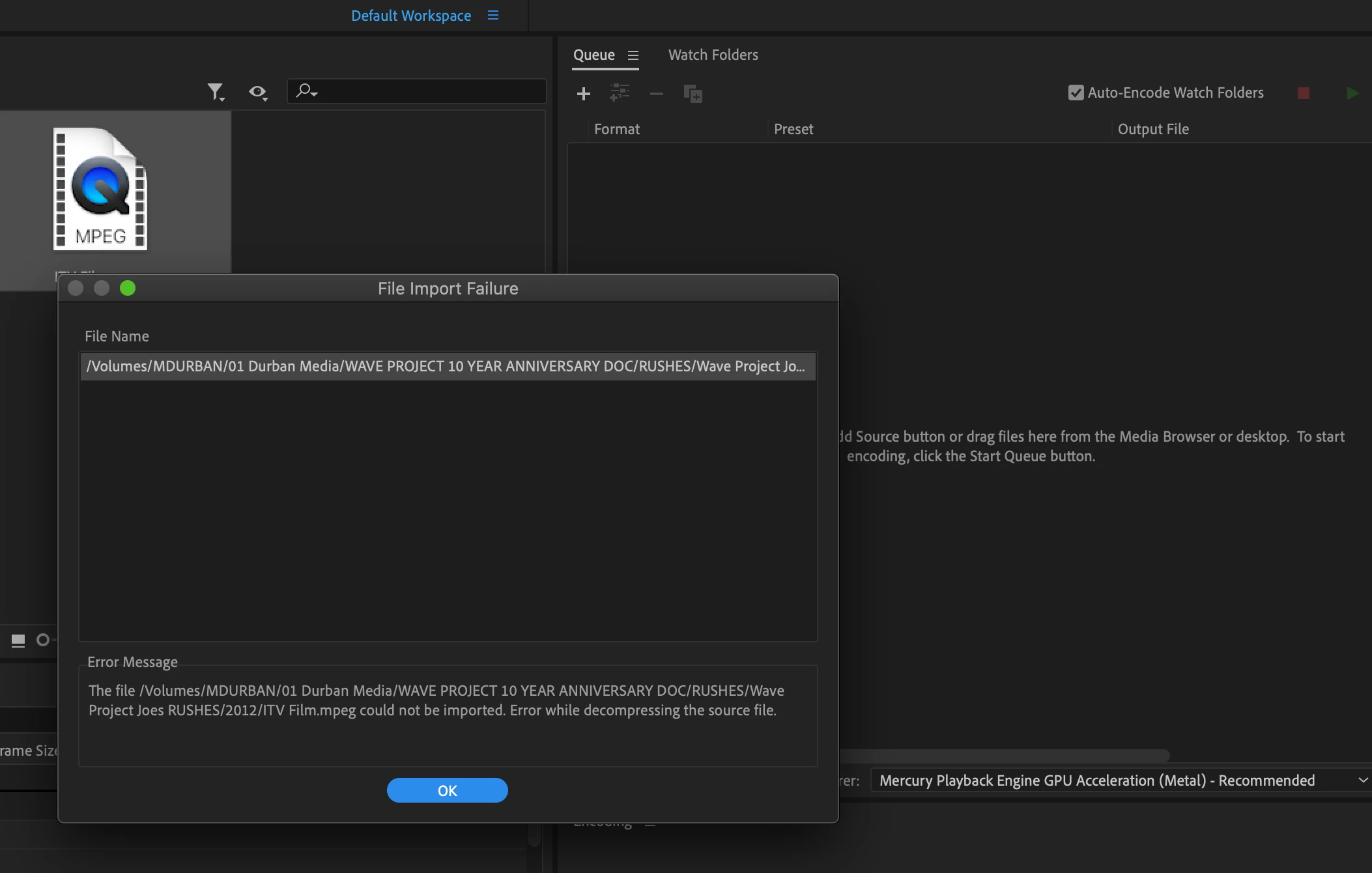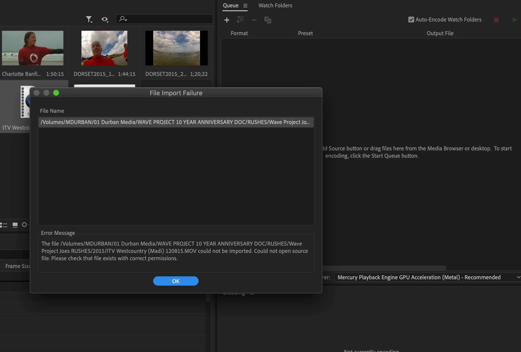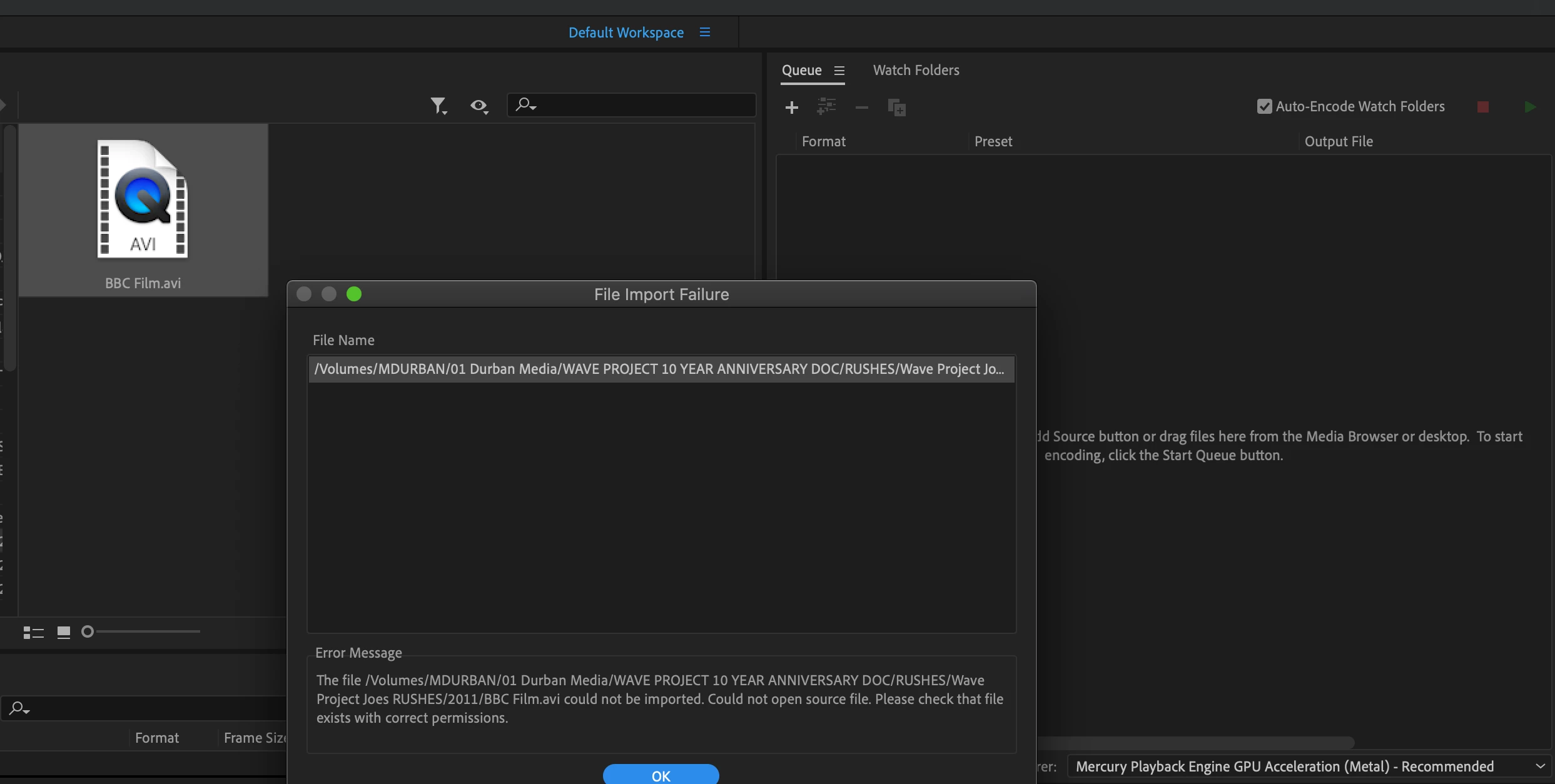 To elaborate: I simply need to imprt some avi/mpeg/mov files into Media Encoder however I keep getting the same message: COULD NOT OPEN SOURCE FILE, please check file exhists with required permissions.